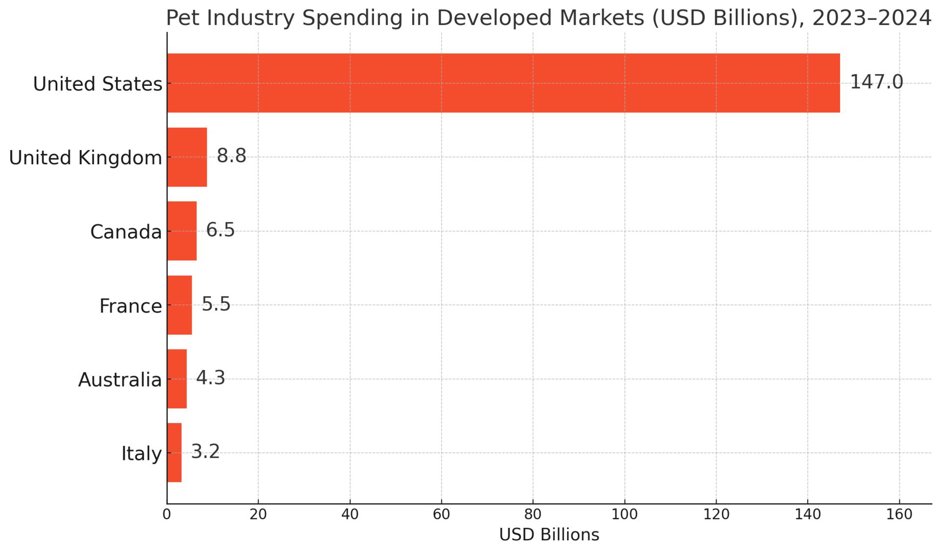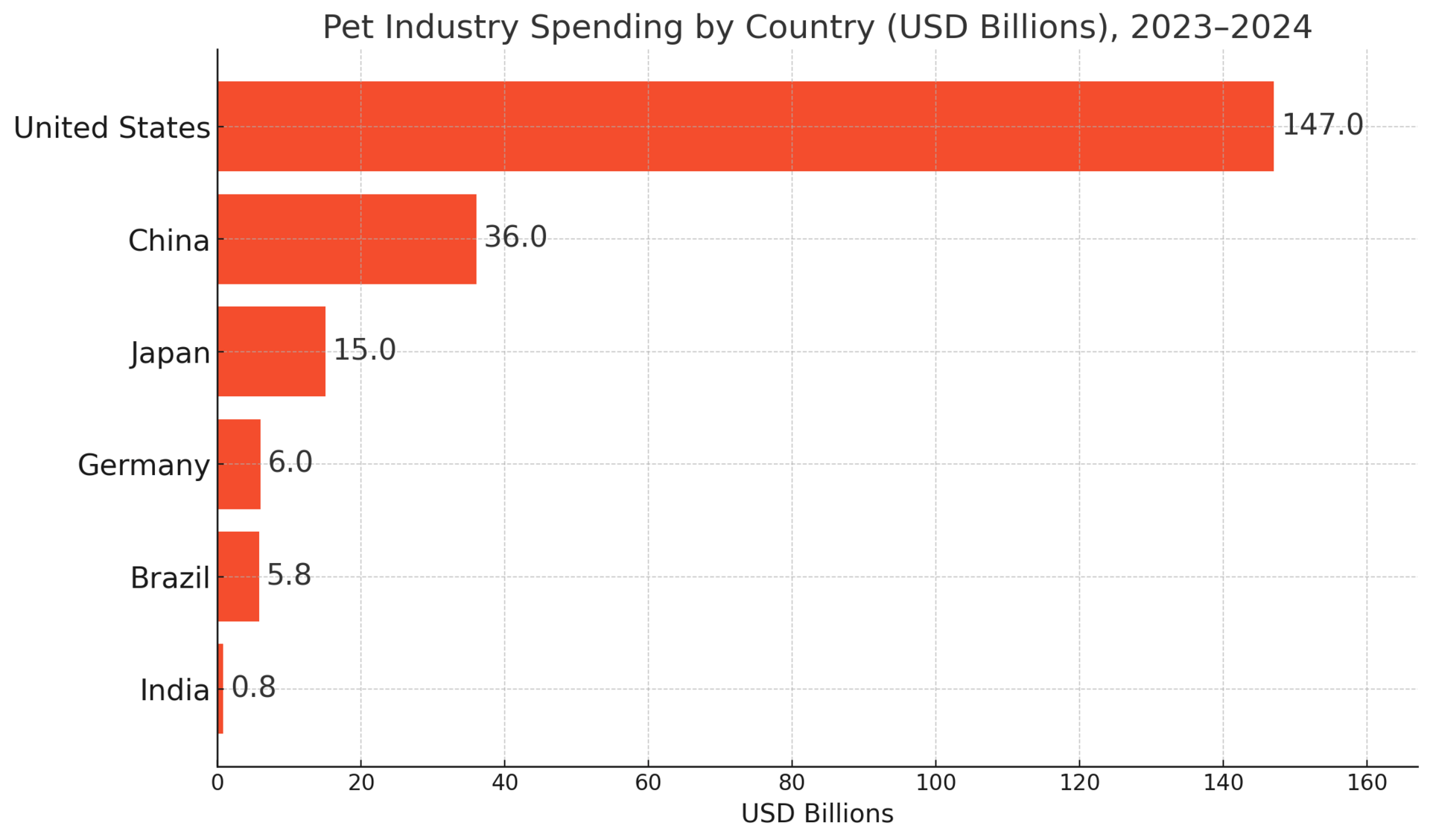 America practically invented the modern pet economy—and it still leads the global pack. Americans spent a record $147 billion on pets in 2023 alone, spanning food, healthcare, boarding, toys, and yes, birthday parties.