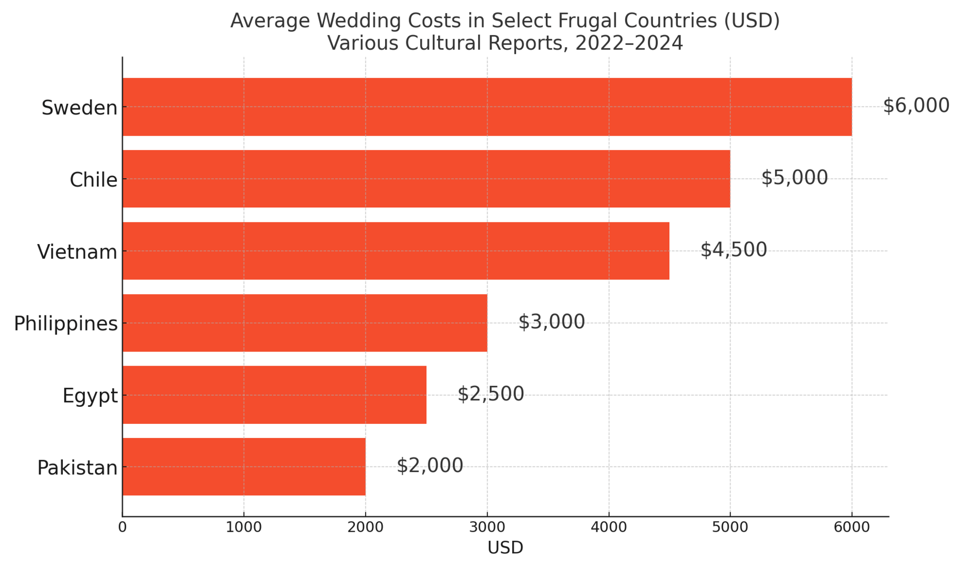 🇸🇪 Sweden: True to its minimalist ethos, Sweden’s average wedding cost is about $6,000, often held in nature or civic spaces.