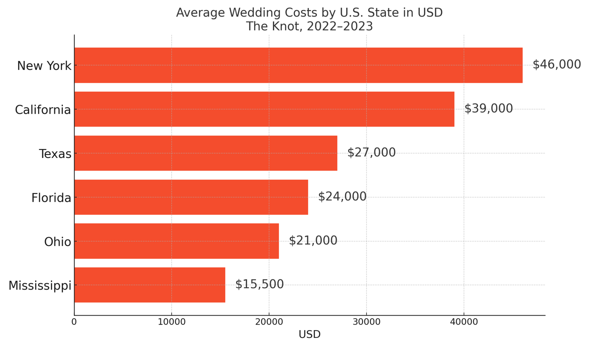 American weddings are the second most expensive globally, averaging $30,000, with wide variance based on location. In states like New York and Massachusetts, that figure can top $46,000.