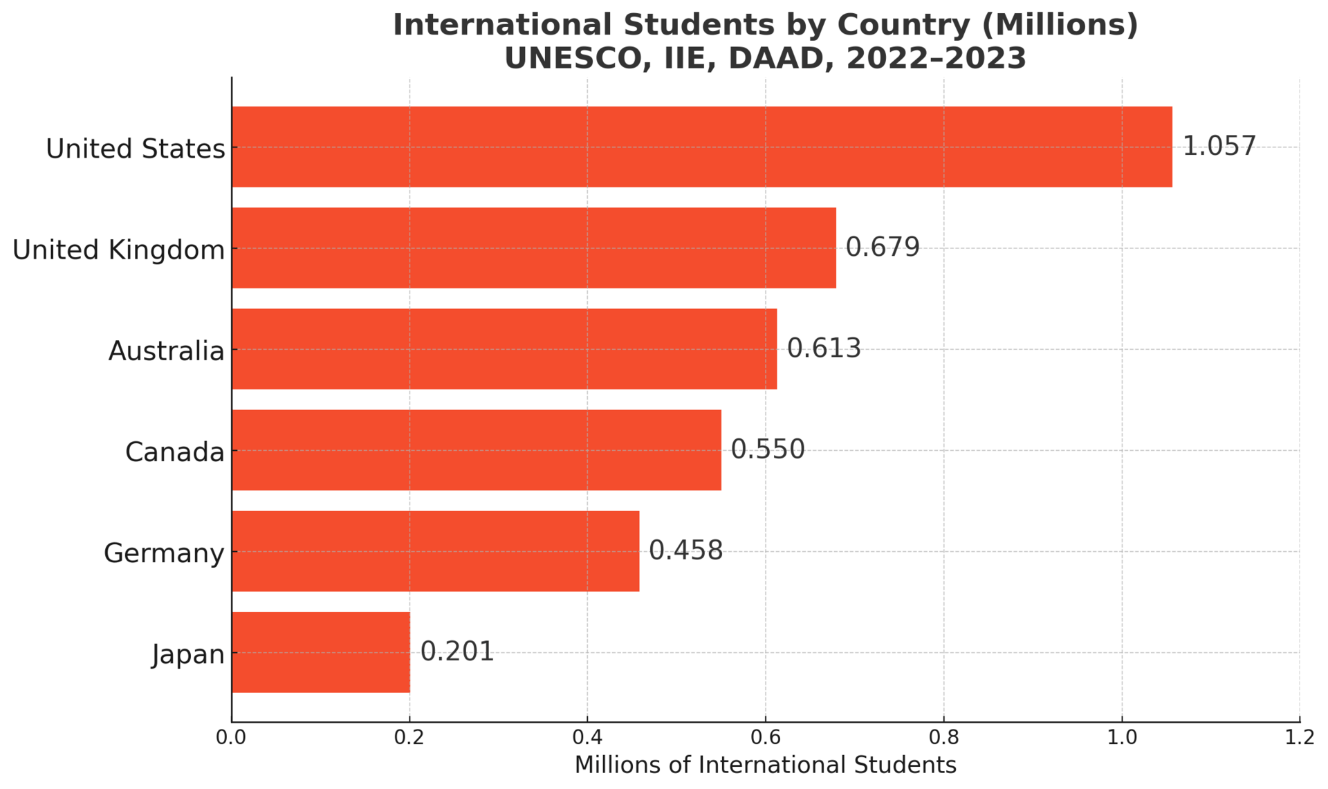 🎓 The United States leads the pack, with over 1 million international students contributing more than $40 billion annually to its economy. The top draw? World-class research universities, abundant funding, and a cultural cachet still hard to match.