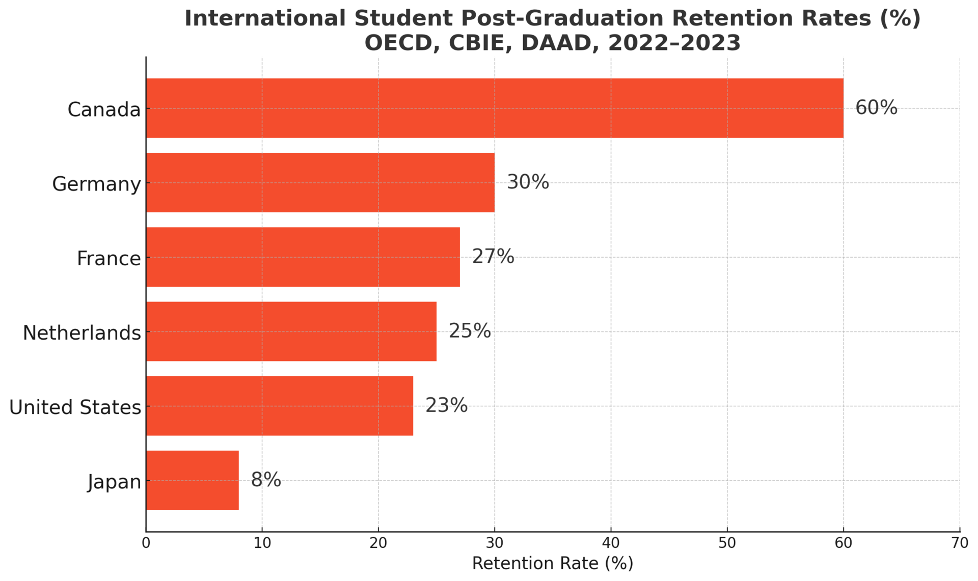 📉 On the flip side, Japan, despite elite institutions, struggles to retain foreign graduates due to language and regulatory barriers—a cautionary tale of talent mismanagement.
