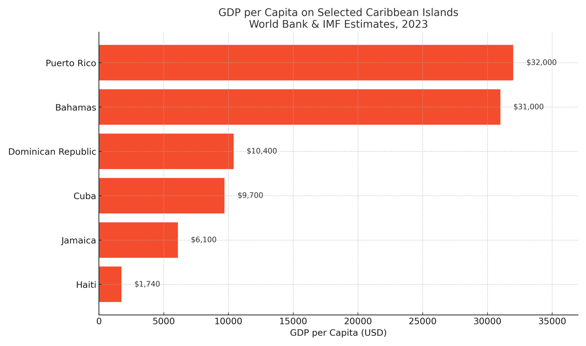 This graph depicts GDP per capita across six Caribbean nations, illustrating how Haiti’s economic struggles stand in stark contrast to both its island neighbor and the wider region.