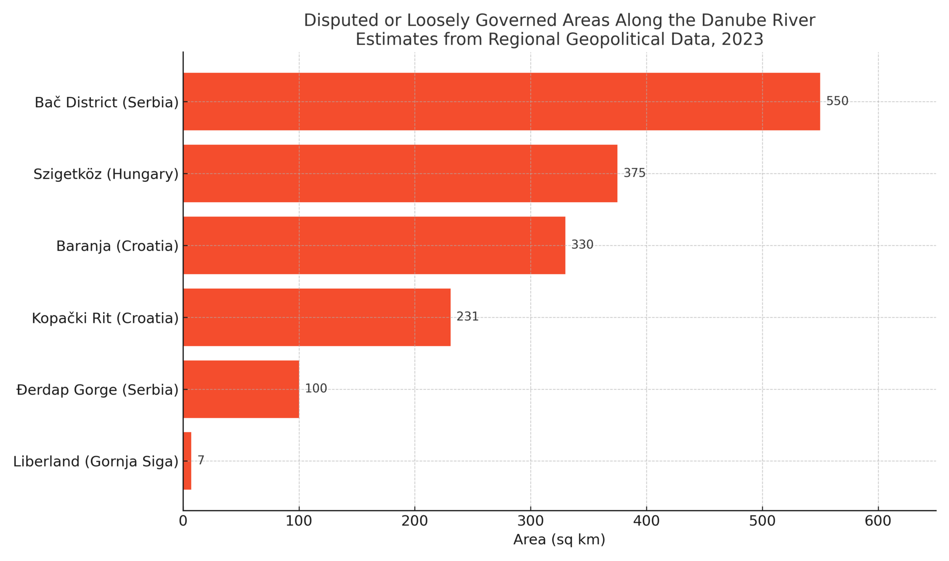 This graph depicts six loosely governed or disputed areas along the Danube River, highlighting how Liberland, though tiny, symbolizes a broader pattern of border ambiguity across the region.