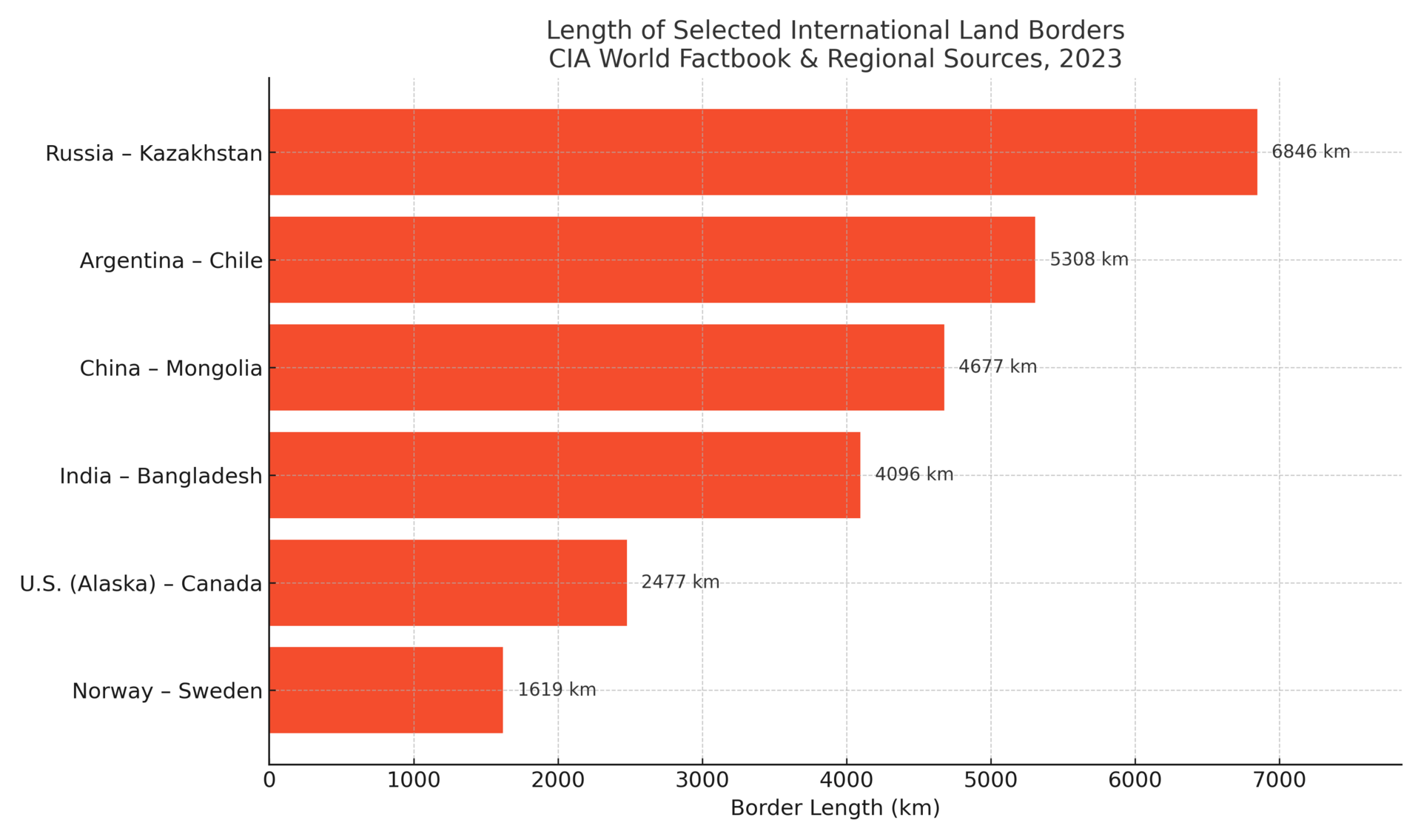 This graph depicts the length of Alaska’s border with Canada relative to other prominent land borders, revealing that despite Alaska’s remoteness, its international boundary ranks among the longest in the world.