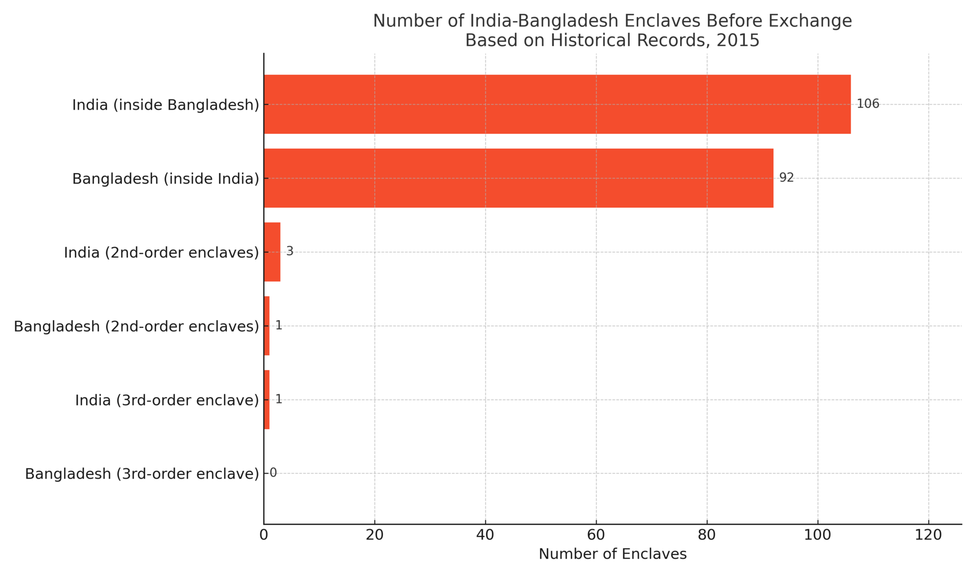 Before 2015, India and Bangladesh shared over 200 enclaves, some nested multiple layers deep. This chart breaks down the number and complexity of these enclaves by country.