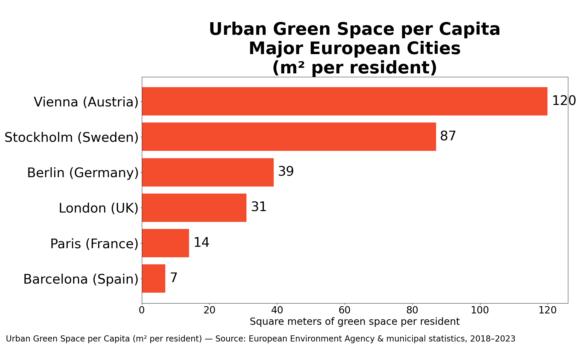 Putting It Into Perspective: Barcelona’s famous Eixample district contains only about 1–2 m² of green space per resident, prompting major efforts to convert streets into pedestrian-friendly “superblocks.”