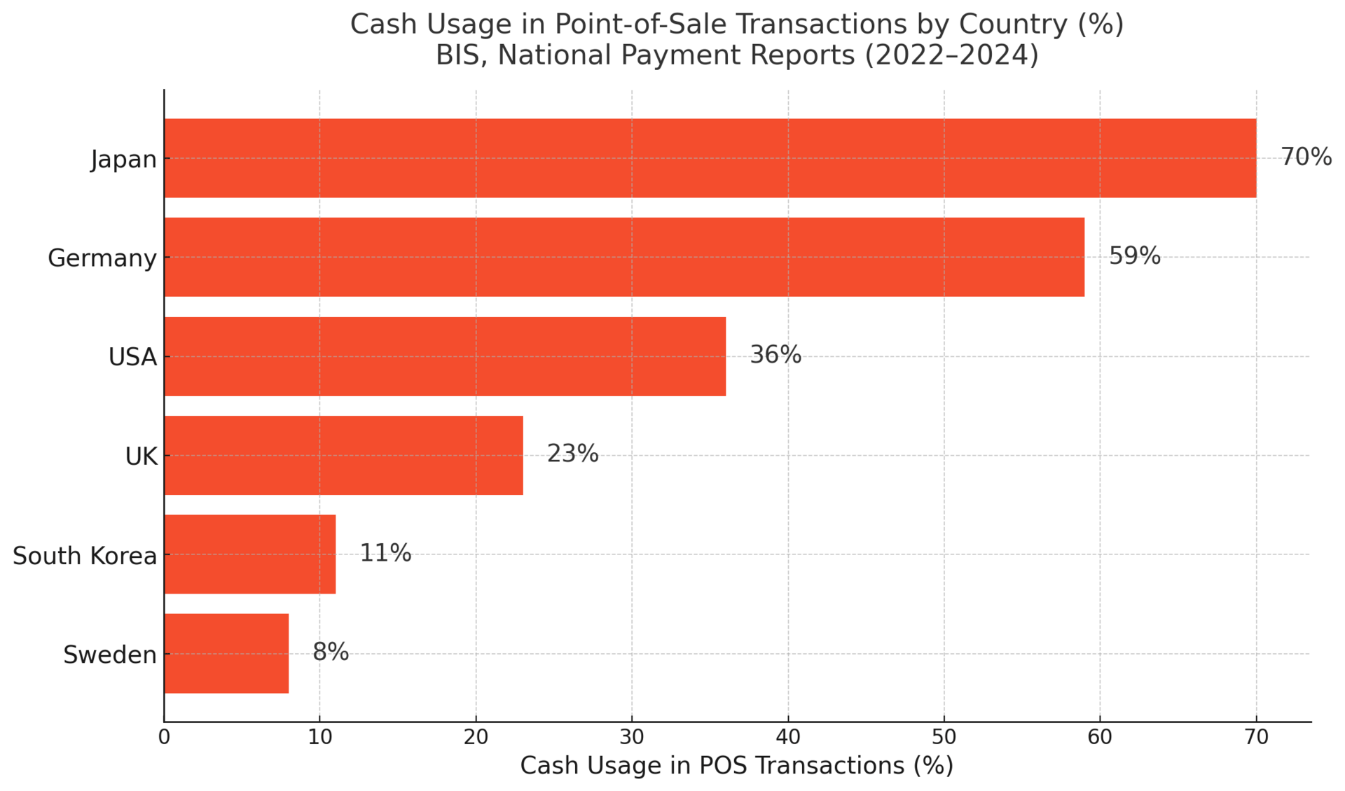 Only about 30% of payments are digital. Many older citizens still prefer the tangible certainty of banknotes. Privacy concerns and disaster readiness (cash works during power outages) also play a big role.