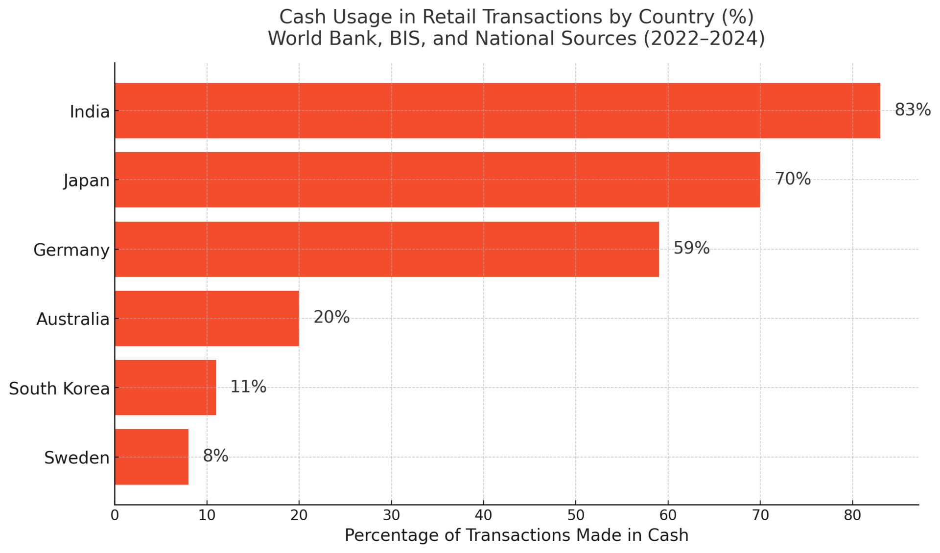 Sweden is arguably the world’s most cashless country. In 2023, fewer than 8% of transactions were cash-based. Even street performers take Swish—a mobile payment app used by over 70% of the population.